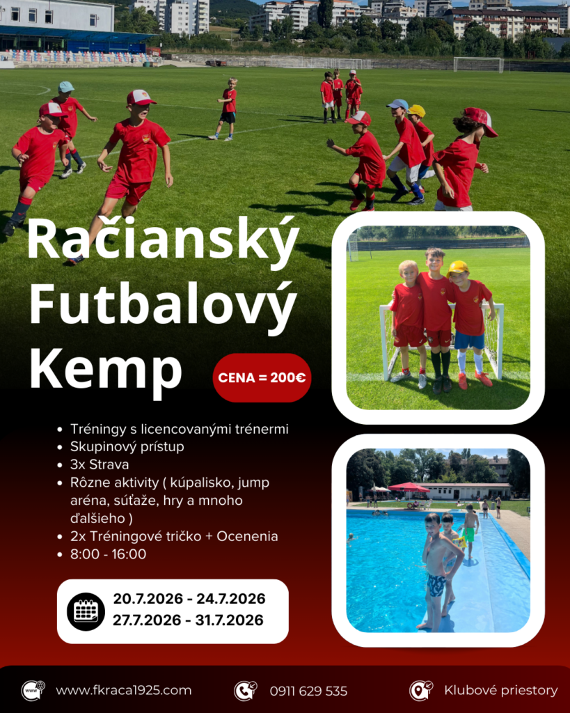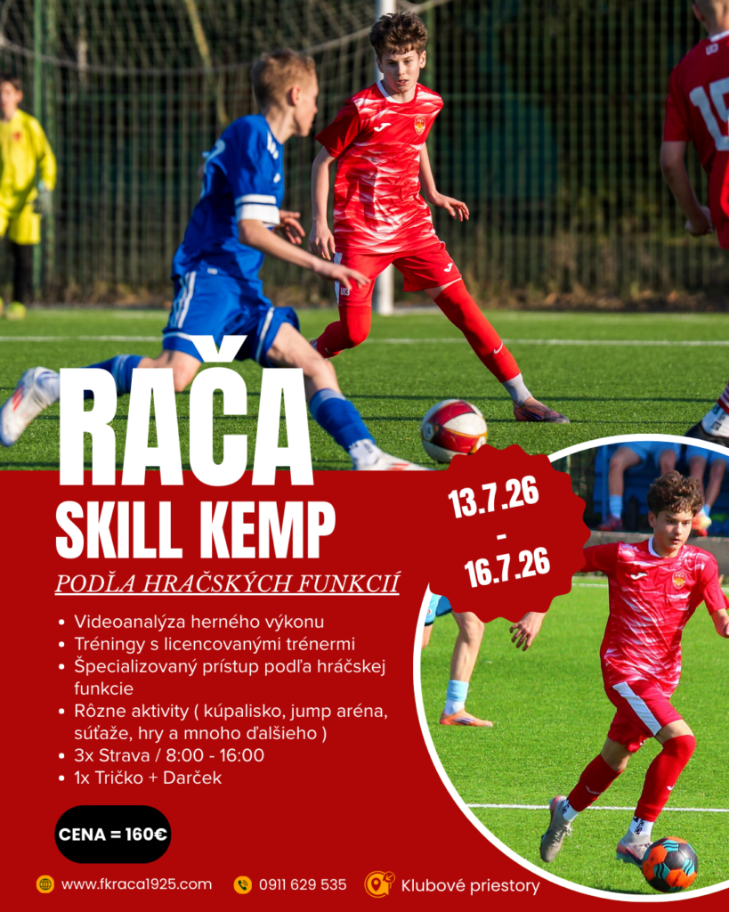 Počas letných prázdnich náš klub organizuje letné futbalové kempy. Novinkou počas tohto leta bude „RAČA SKILL KEMP“, ktorý bude určený pre žiacku sekciu (U12 – U15).